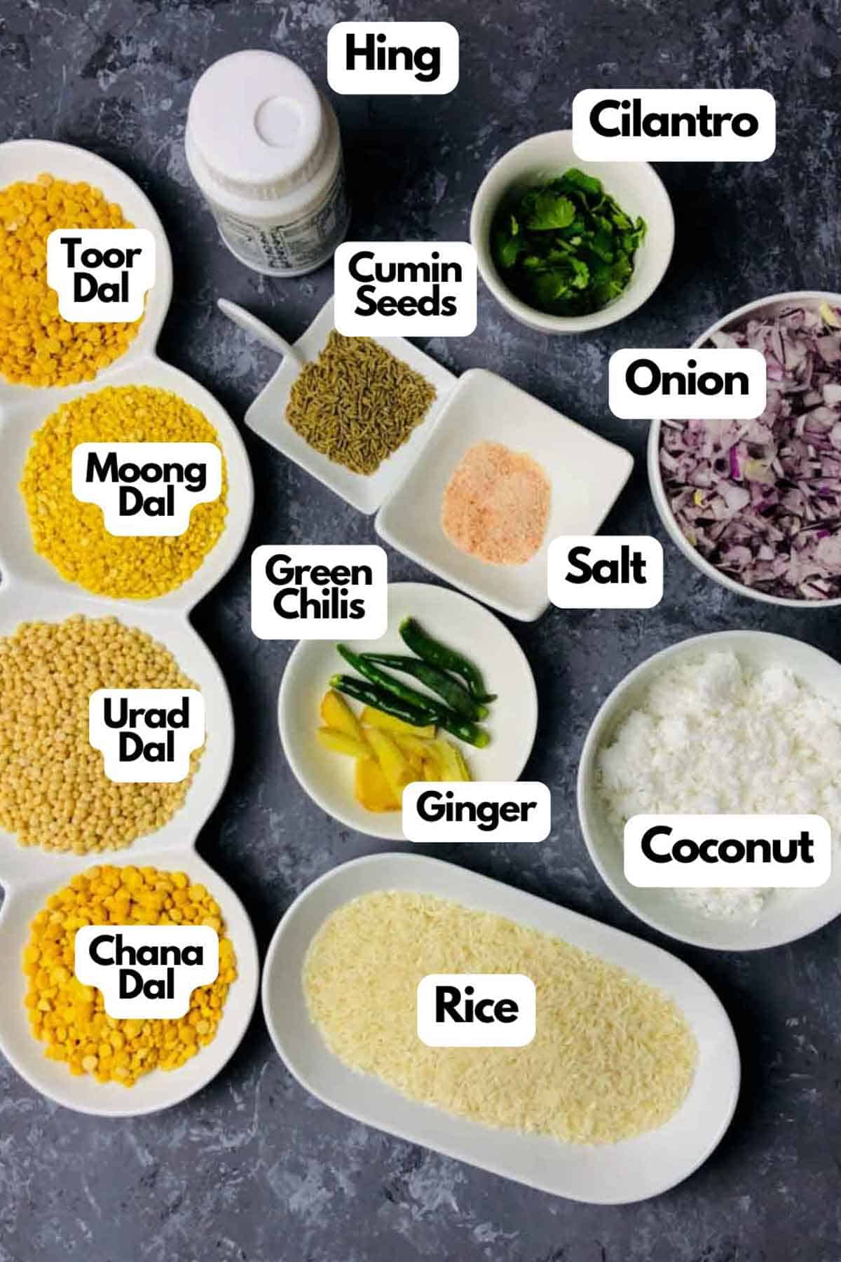 Lentils: Four varieties of lentils are used in equal quantities to make the batter - toor dal (tuvar dal or pigeon pea), moong dal (yellow lentil), urad dal (skinned black gram), and chana dal (channa dal, split yellow peas or Bengal gram).
