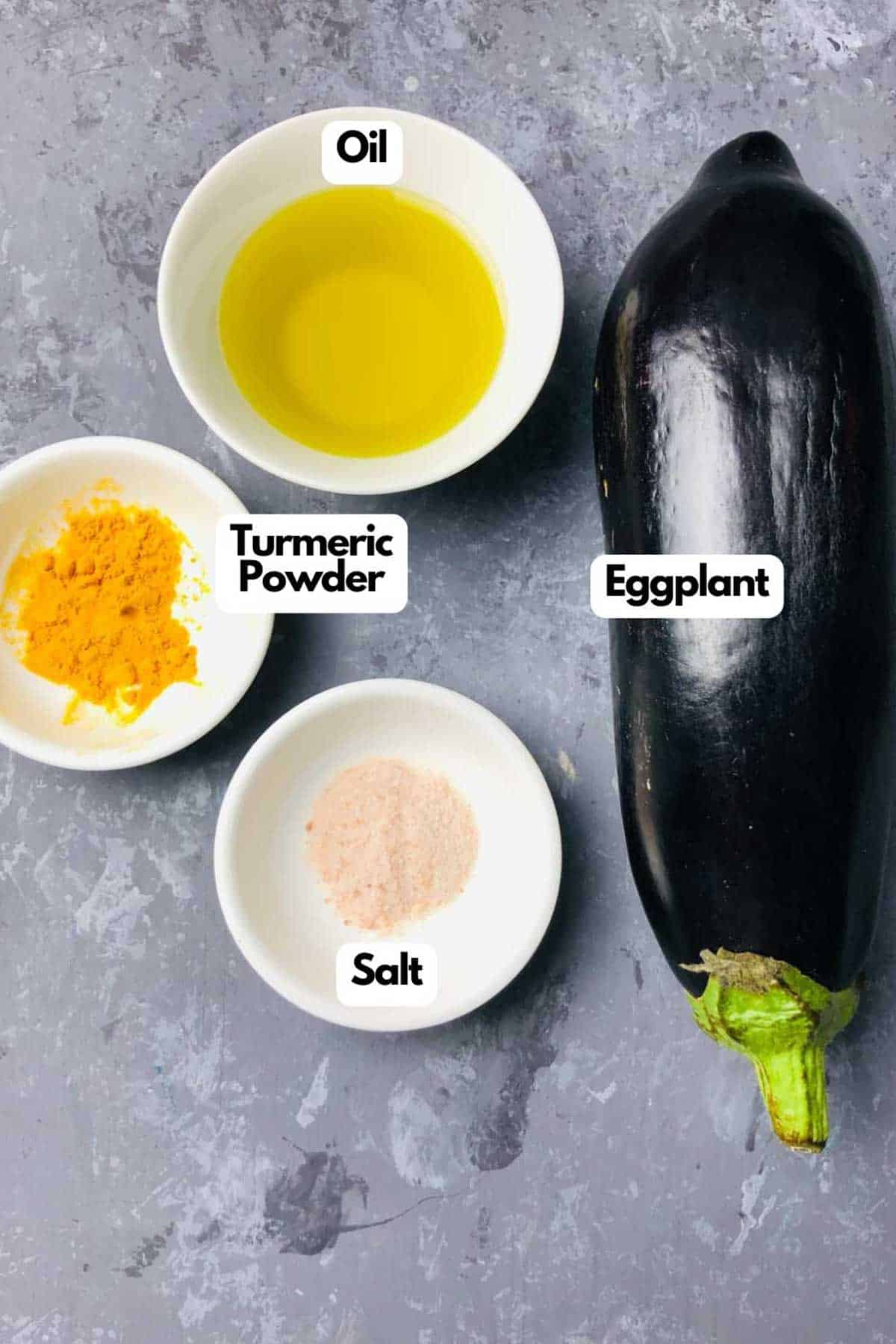 Salt and turmeric: The eggplant slices are seasoned with salt and turmeric.