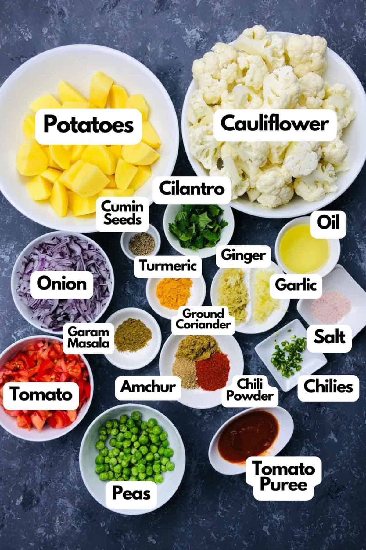 Cauliflower and potatoes: These are the main ingredients of this dish. Choose cauliflower that has a firm and tight head. Keep the size of the florets even so that they can cook evenly. Cut the potatoes into medium-sized cubes.
