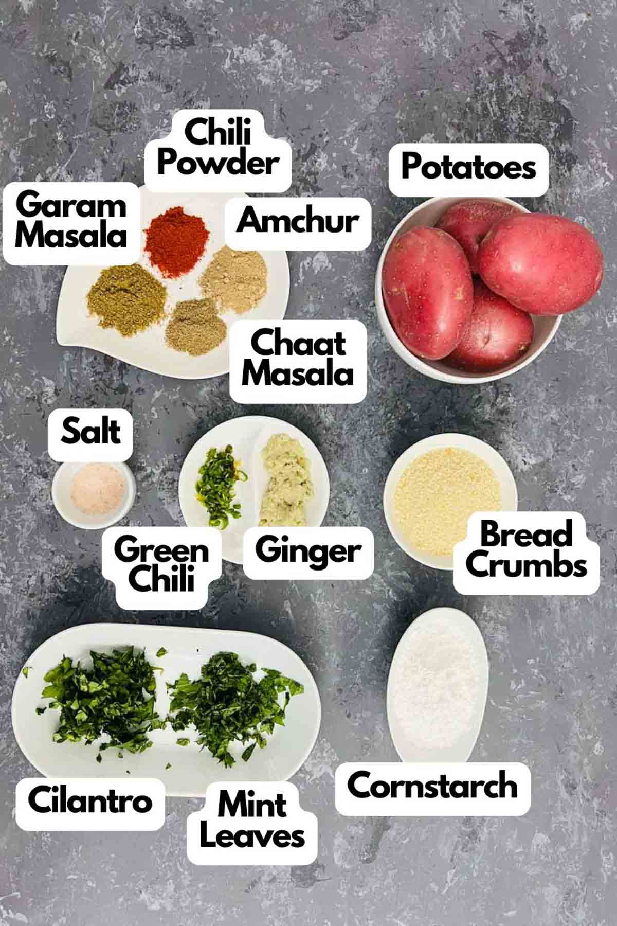 - In a large bowl, combine boiled and mashed potatoes, ginger, green chili, cilantro, mint leaves, garam masala, chili powder, chaat masala, amchur, and salt.