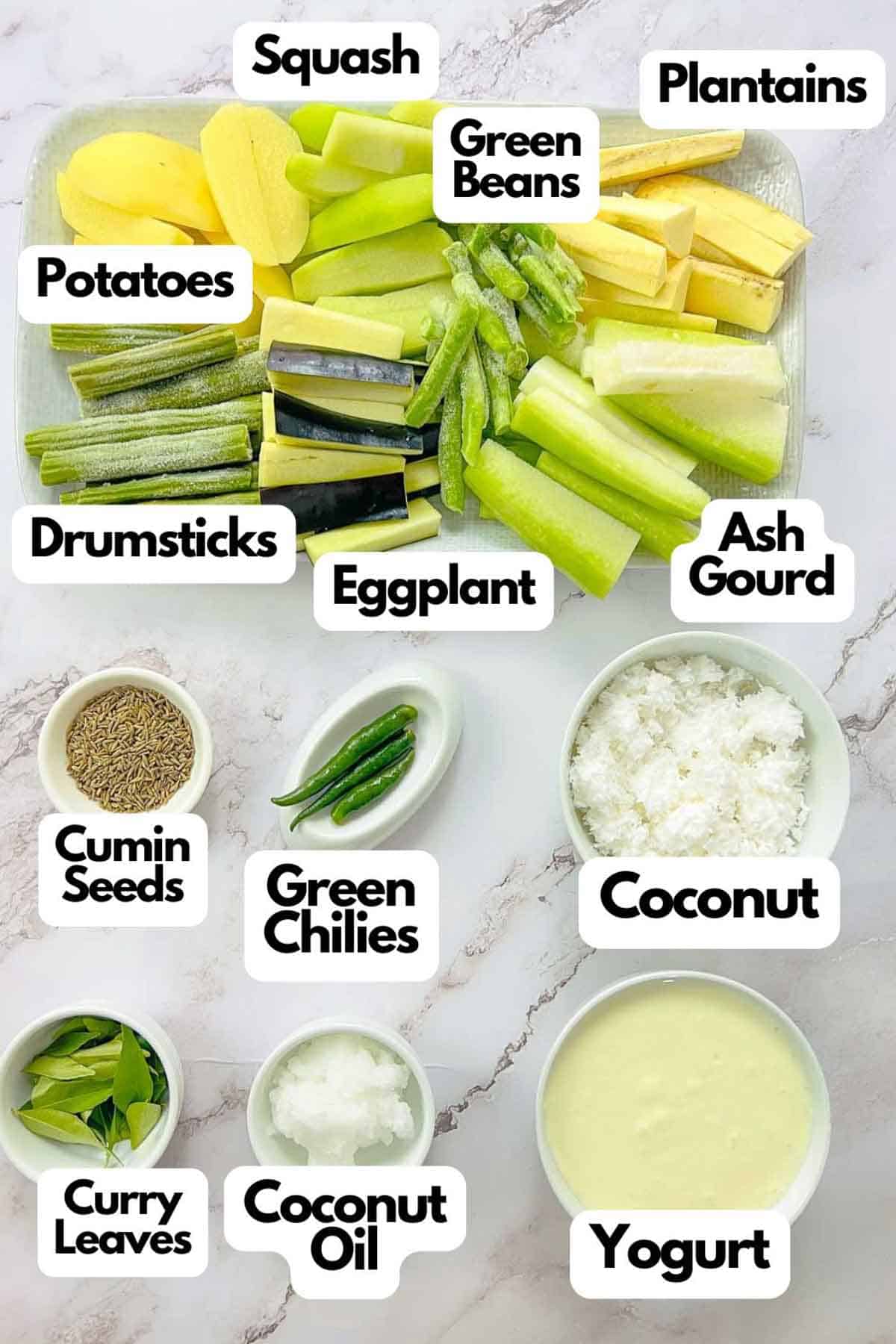 Vegetables: I am using drumsticks, ash gourd, eggplant, plantains (raw banana), green beans, potatoes, and chayote squash.