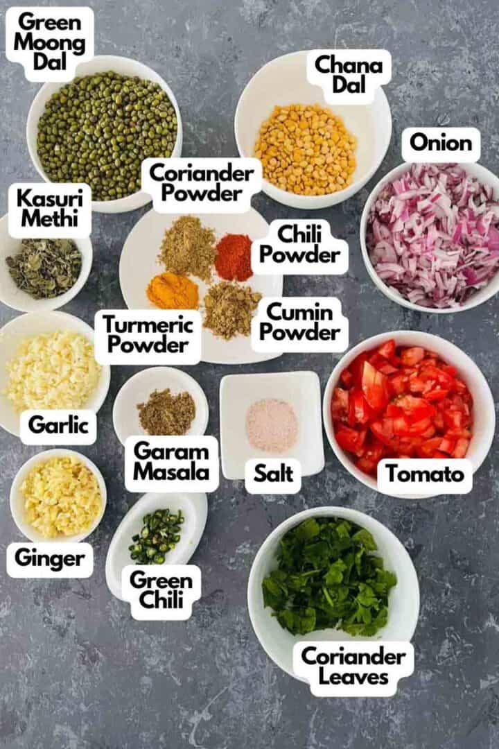 Green moong dal: Also called whole green gram or mung bean, this is the main ingredient for this dish.
