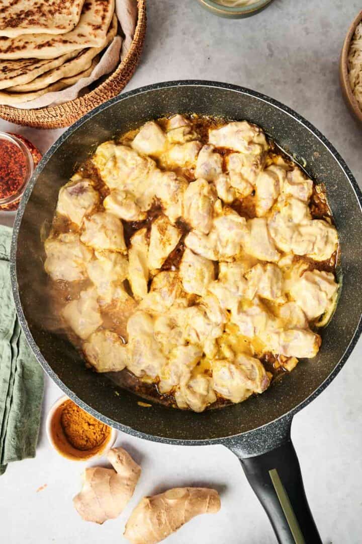 Add the marinated chicken to the skillet, letting any excess marinade drip off. Cook the chicken until it turns white on all sides. The yogurt in the marinade prevents the chicken from browning too much.