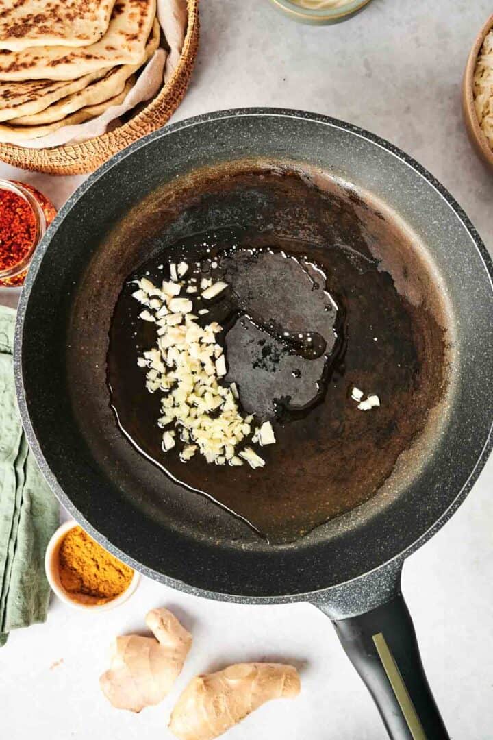 Heat the ghee in a skillet or pot over medium-high heat. Add chopped garlic cloves and grated ginger root. Sprinkle in some garam masala, ground cumin, and chili powder. Cook these spices for a few seconds until they release a fragrant aroma.