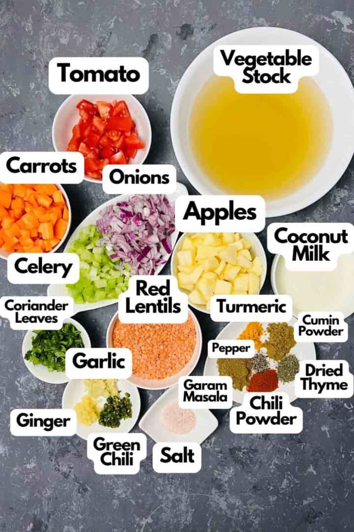 Spices: The soup is seasoned with Indian spices along with dried herbs. I use garam masala, cumin powder, turmeric powder, chili powder (or cayenne pepper), and dried thyme. You can replace these powdered spices with Madras curry powder or mild curry powder.