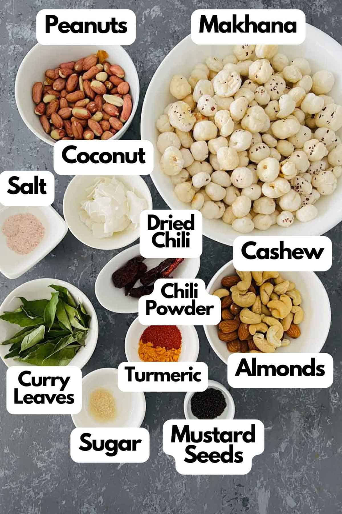 Chivda (or chiwda/chevdo) is an Indian snack consisting of a mixture of dry ingredients and spices. The most popular ones are made with beaten rice (poha) or makhana as the main ingredient. This main ingredient is combined with peanuts, dried coconut, and other nuts and is seasoned with spices and curry leaves.