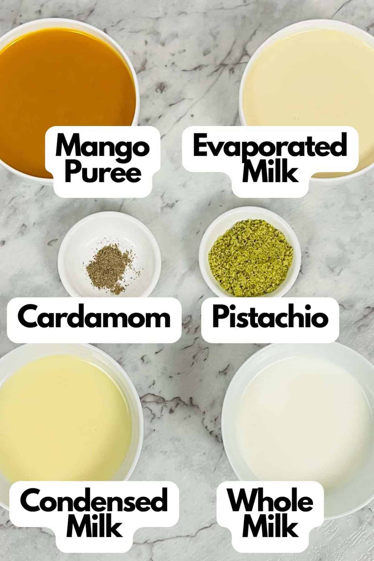 - In a large bowl, take mango puree, evaporated milk, condensed milk, whole milk, ground cardamom, and powdered pistachio.