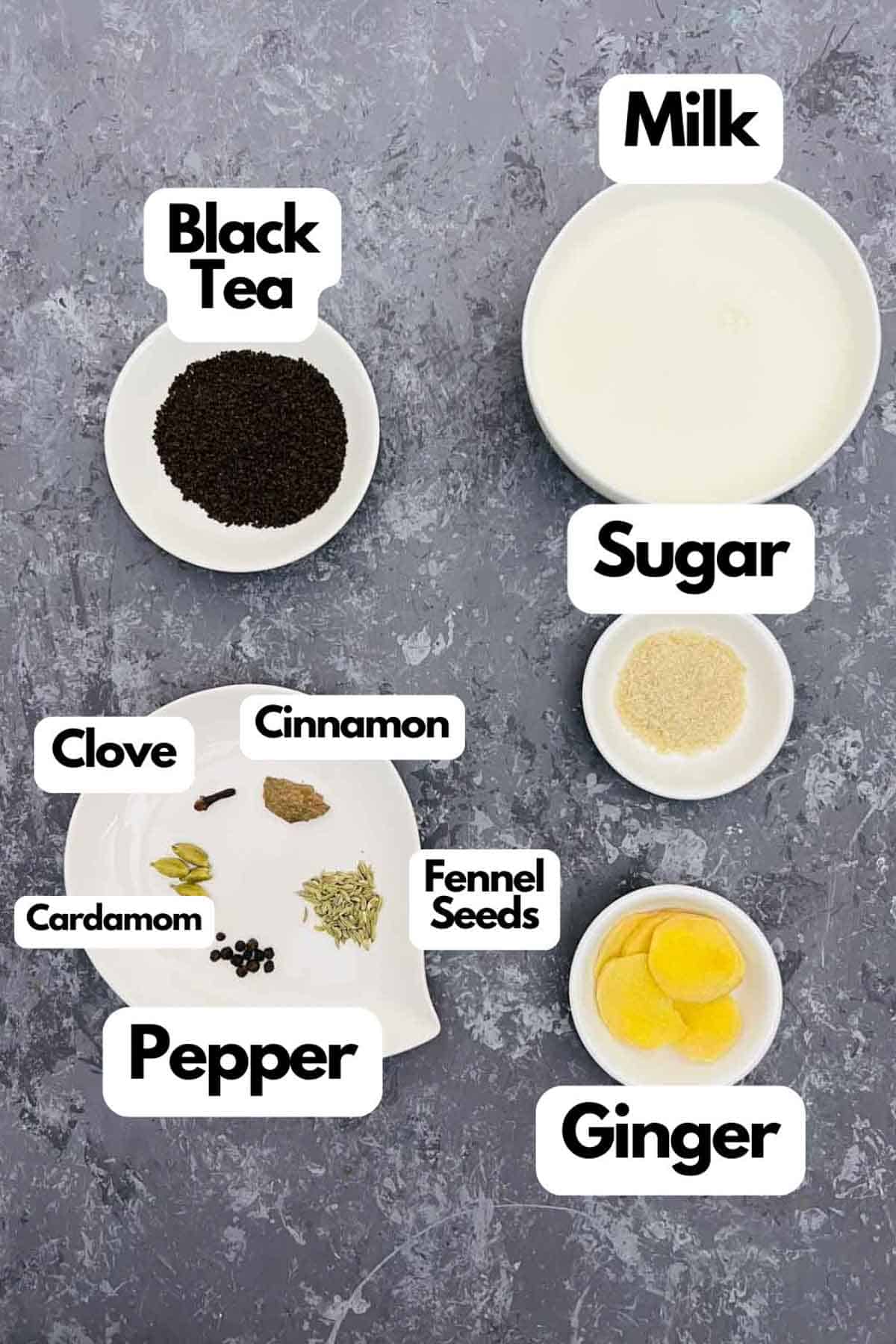 Spices: The spices I use are green cardamom pods, cinnamon stick, clove, fennel seeds, and black peppercorns. I also use fresh ginger.