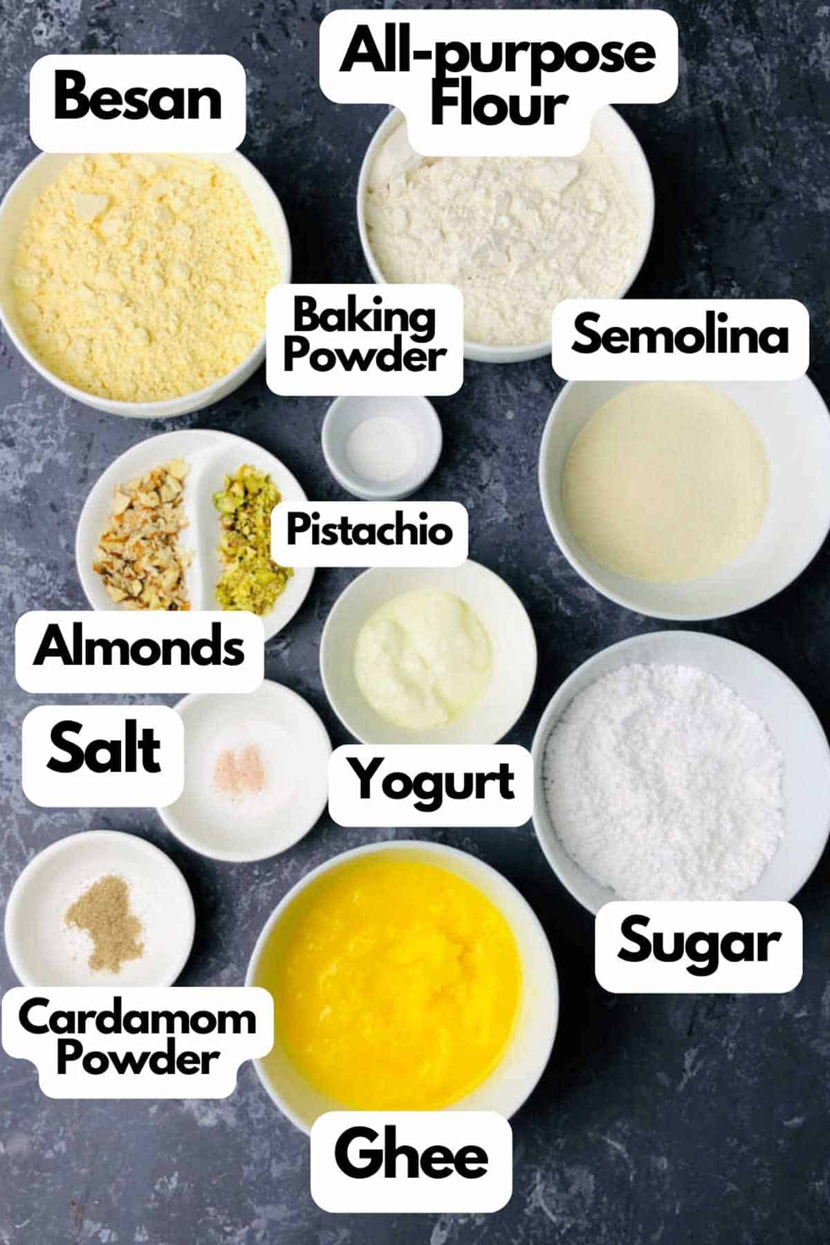 Flour: Plain flour (maida), gram flour (besan/chickpea flour), semolina (suji/fine).