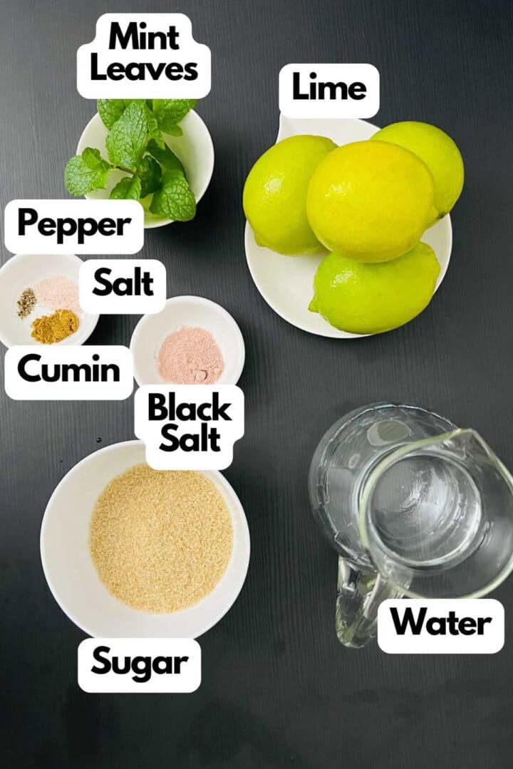 - Combine lime juice, water, sugar, salt, black salt, ground pepper, cumin powder, and mint leaves in a jug. Mix well.