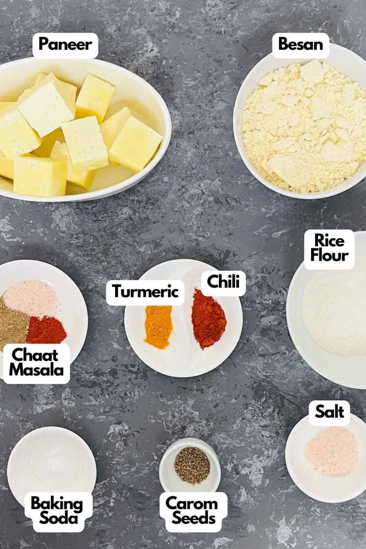 Spices: I use chaat masala and chili powder (or cayenne) to coat the paneer. I also use carom seeds (ajwain), ground turmeric, and chili powder for the batter.