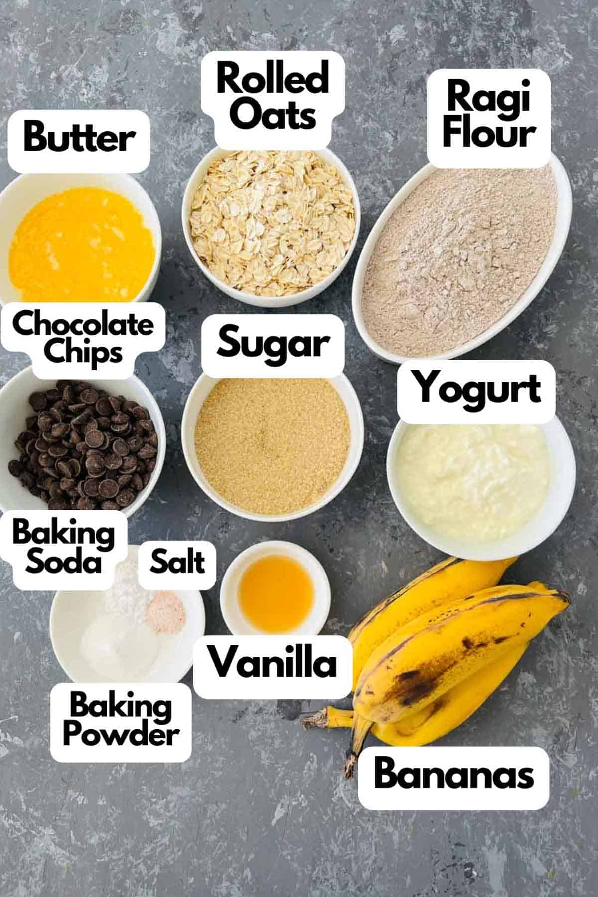 - In a mixing bowl, sift in the ragi flour. To this, add oats, baking powder, baking soda, and salt. Mix everything well and set it aside.