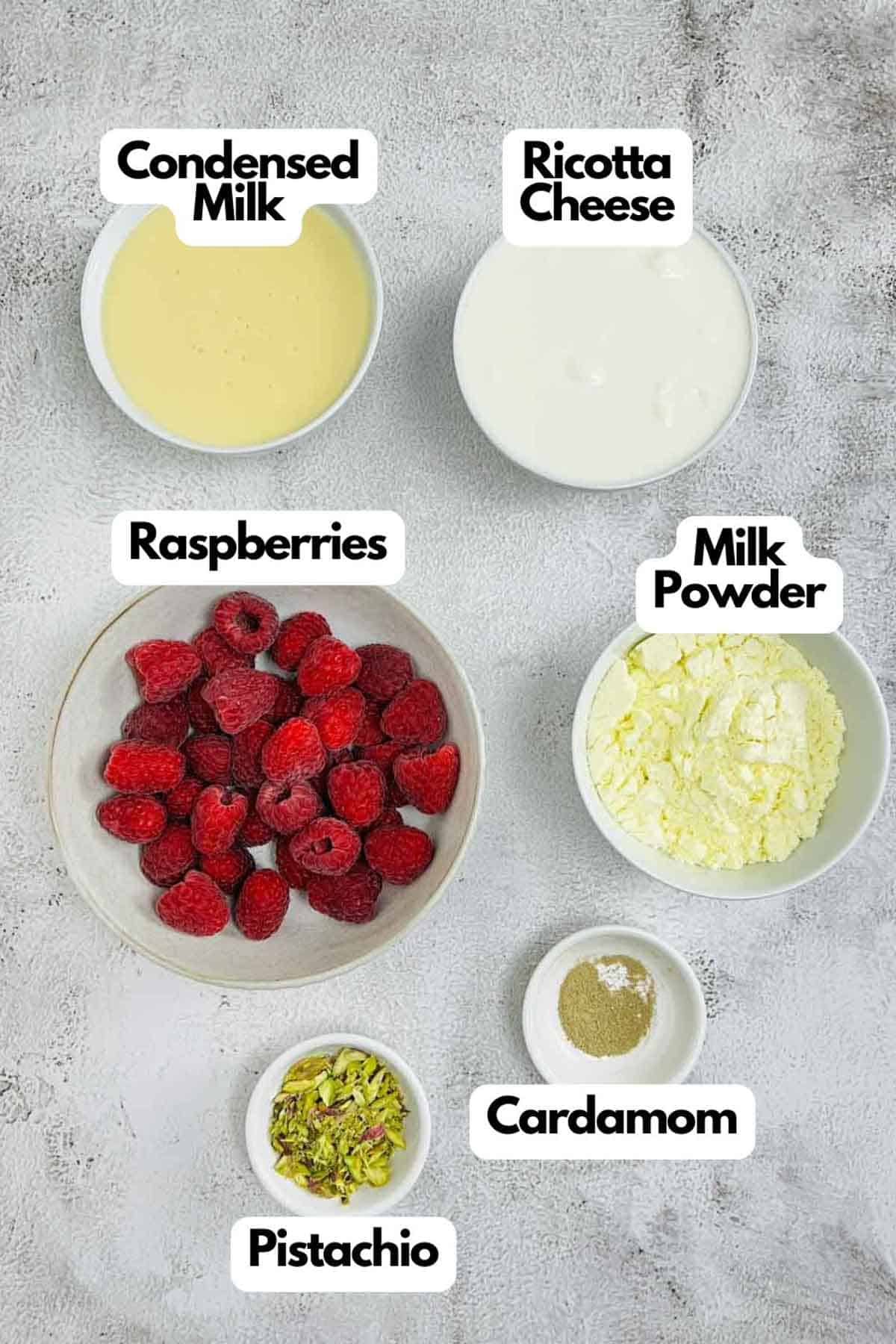 Ricotta cheese: I am making this raspberry kalakand using ricotta cheese. Traditionally, freshly made curdled milk solids are used to make kalakand; however, ricotta is an easy substitute that yields the same result.