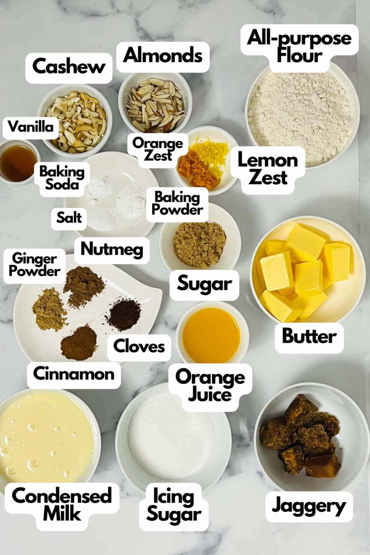 Wet ingredients: We will need orange juice, unsalted butter, condensed milk, and vanilla extract.