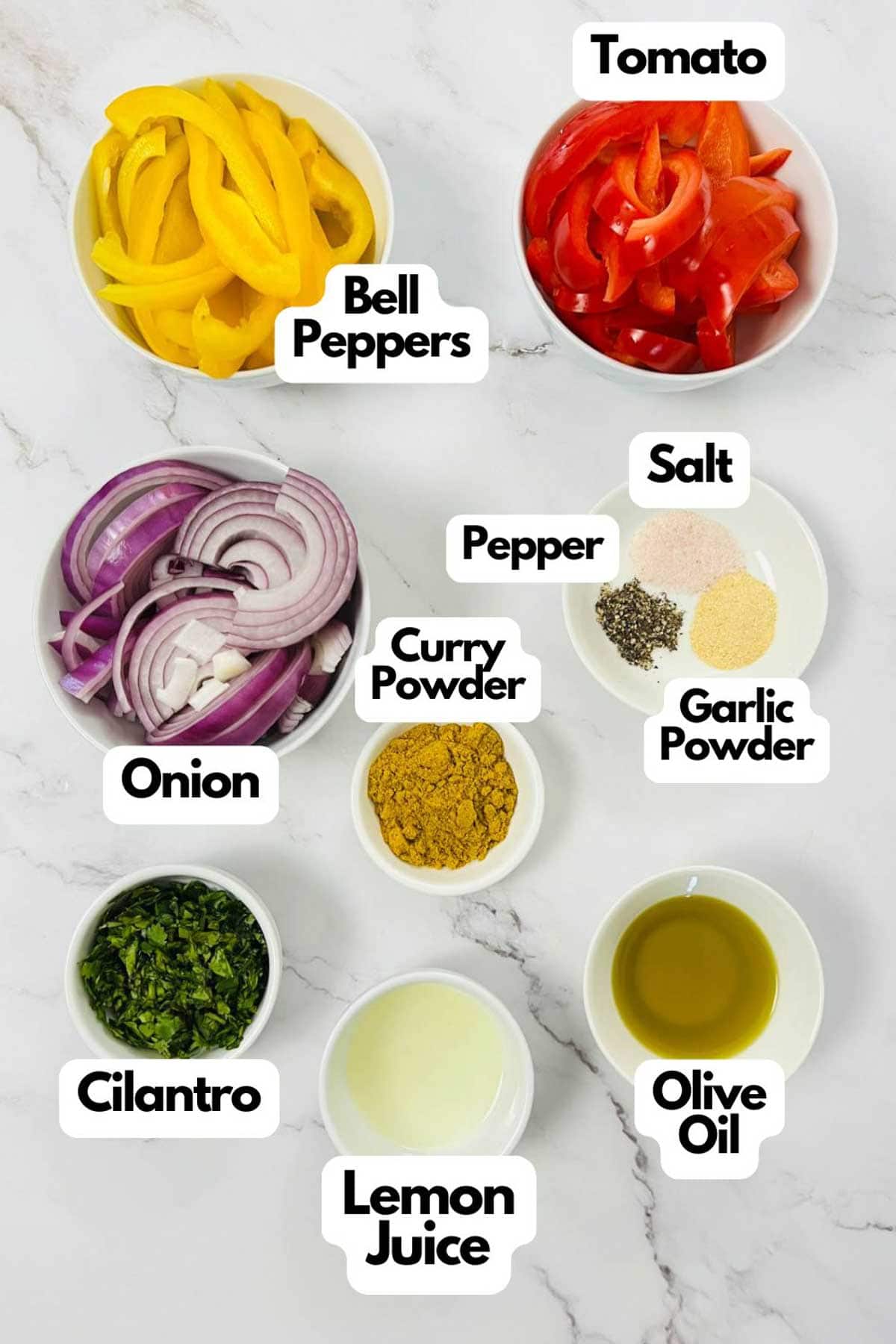 Step 1: In a large mixing bowl, add olive oil, curry powder, garlic powder, salt, and pepper. Give it a good mix. To this, add the bell peppers and onions. Mix well, making sure the seasoning is evenly coated.
