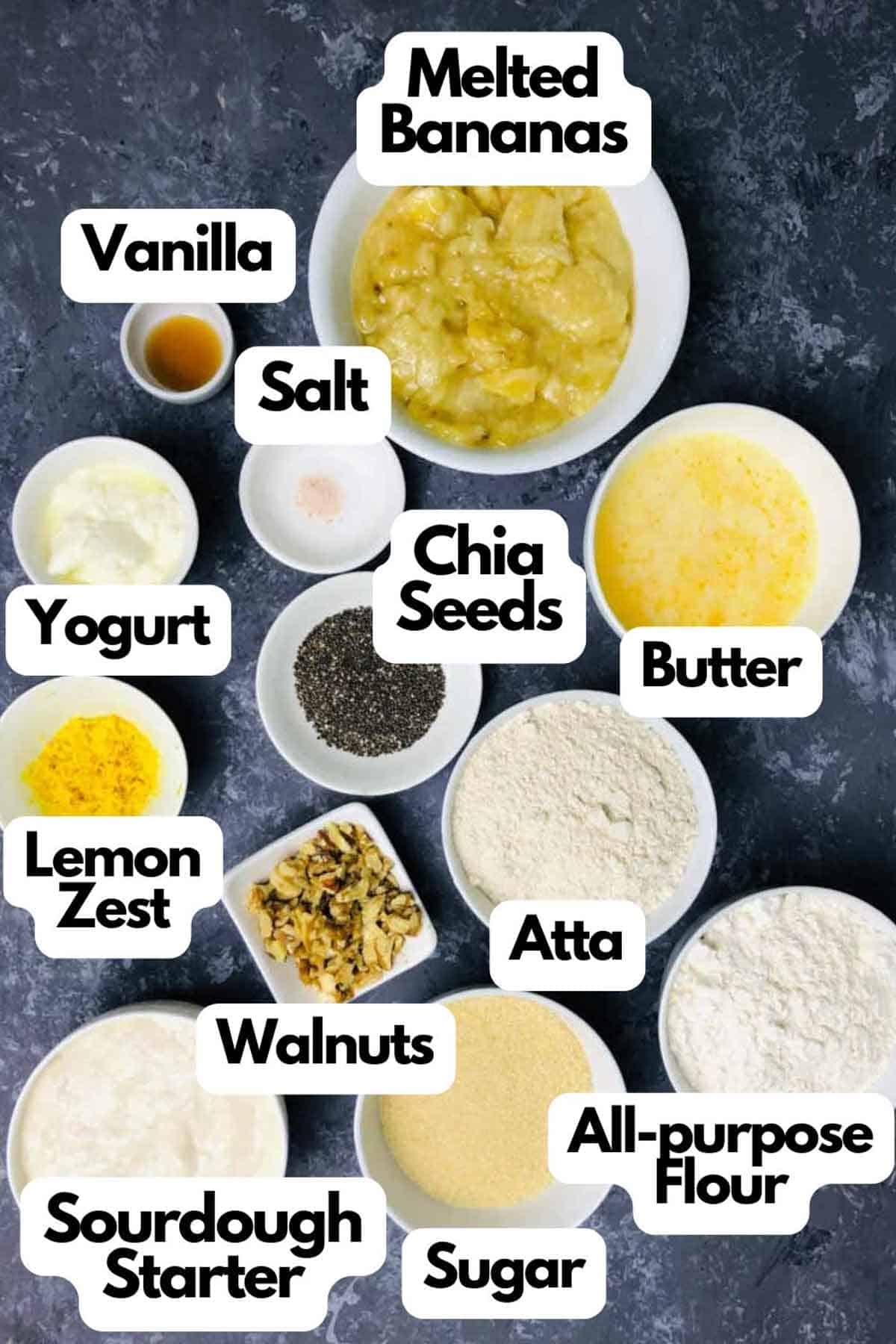 Yogurt and butter: Use plain yogurt and unsalted butter to make this banana bread. Melt the butter and let it cool down before using it. You can replace butter with melted coconut oil, vegetable oil, or avocado oil.