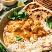 Turn off the heat and add the butter, stir everything together, and serve immediately with rice, lime, naan bread, and fresh herbs.