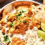 Serve the tikka masala chicken with white rice, heavy cream, and cilantro leaves.